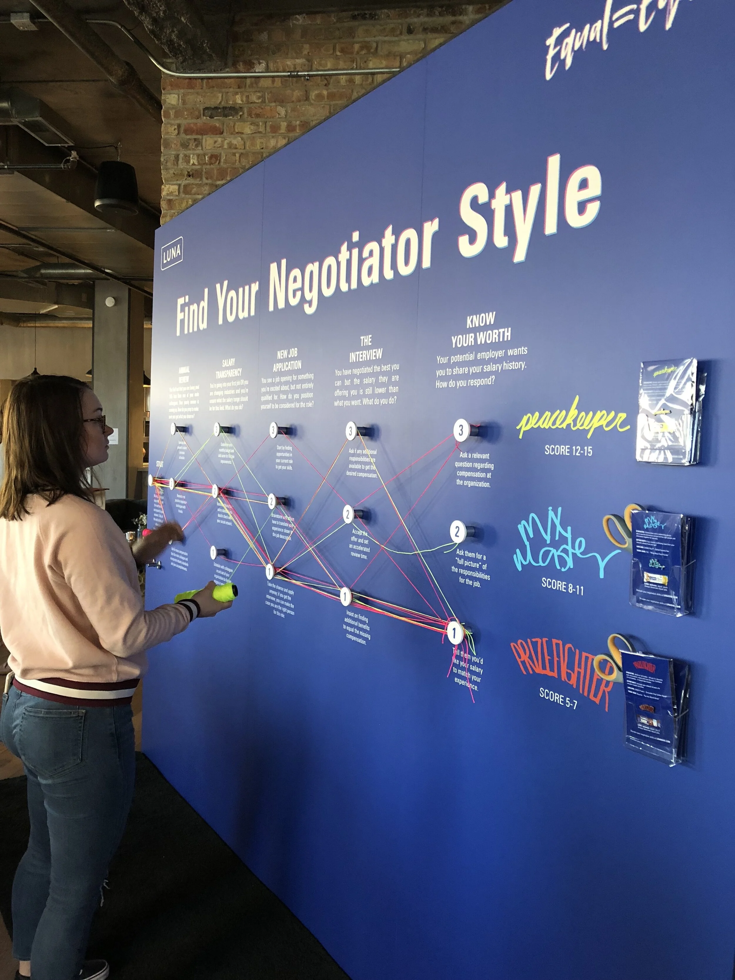 Formulated experiential activation to educate women about negotiation styles and tactics, driving product sales and traffic to lunabar.com